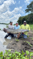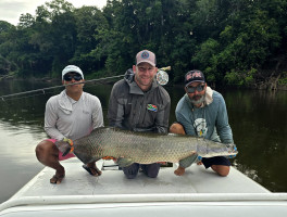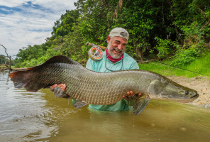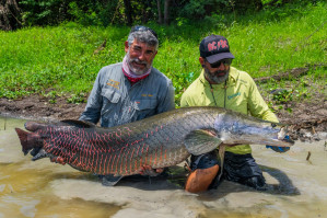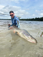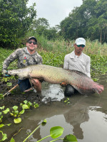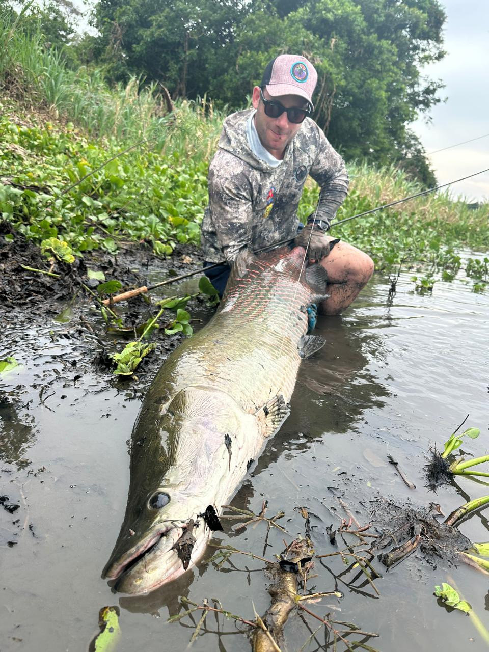 Un rostro familiar en Pirarucú, Matt regresó por quinta vez y fue recompensado con una captura inolvidable: un enorme arapaima de 232 cm. El pez explotó en la superficie y luchó con fuerza imparable hasta finalmente ser controlado. Un verdadero gigante de la selva y un momento que encarna todo lo que hace especial al Pirarucú.