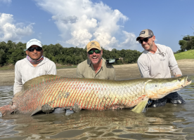 Apuntar al arapaima con mosca es una prueba de precisión y resistencia. Requiere lanzamientos certeros, presentación impecable de la mosca y persistencia inquebrantable para provocar el ataque. Una vez enganchado, el combate es electrizante — marcado por carreras veloces, saltos inesperados y una fuerza implacable que desafía incluso el equipo más resistente.