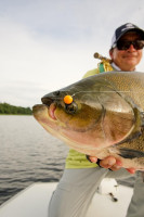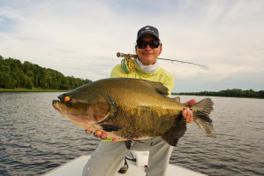 The afternoon session brought muddy edges from the afternoon rain and the arawana were very hard to find, so we switched back to fishing for the Tambaqui. Several hookups, great tug of war sessions. Then it happened, a giant Tambaqui. The bite was soft but I set the hook into a monster that went into a full run. The reel was screaming and the line was fast dumping off the reel. I was finally able to gain some line back to the reel only to see his powerful run strip all that was gained. In time I was able to get the giant close to the boat. Once by the boat he still would not give up for several more minutes until finally I turned him and rolled him into the net. A true goliath for the species in these parts—19 and a half pounds of hard-fighting fish. A testament to what these waters produce. We quickly took our photos, allowed him to rest, then released him back to fight again another day.