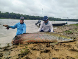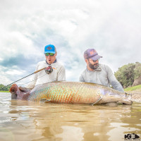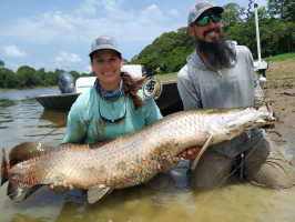 For our fifth week of the season, we were joined by some great anglers, including Richard, Chris, Diane (one of the toughest anglers were have ever met), and our friend Jako Lucas. All amazing anglers, they did very well on the water, and among the many highlights was landing the largest arapaima of the season — a 2m, 37cm giant. We also landed well over 30-40 arowana. The water came up some, and that normally helps with number of fish caught. And to our surprise, we had some success with arapaima taking poppers!